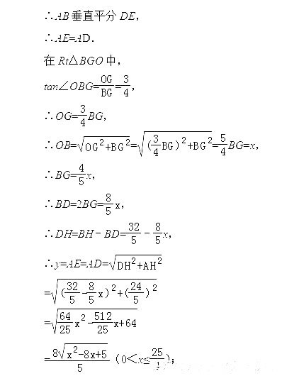 (2)过点A作AH⊥BC于H,如图(2),运用三角函数、勾股定理及面积法可求出AC、AB、AH、BH、CH,根据垂径定理可得DF=EF,再根据线段垂直平分线的性质可得AE=AD.然后在Rt△BGO中运用三角函数和勾股定理可求出BG(用x的代数式表示),进而可用x的代数式依次表示出BD、DH,AD、AE,问题得以解决;